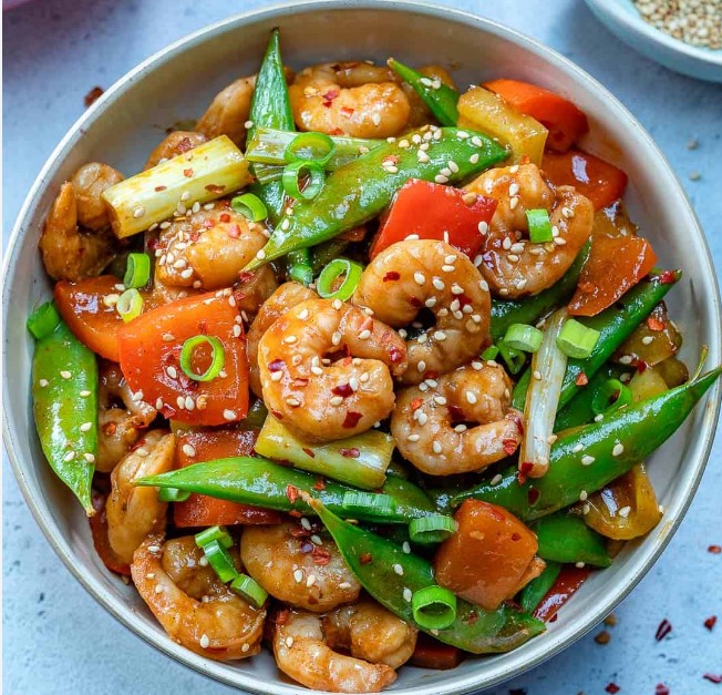 Sliced chicken glazed in high heat and cooked with red chili, capsicum...